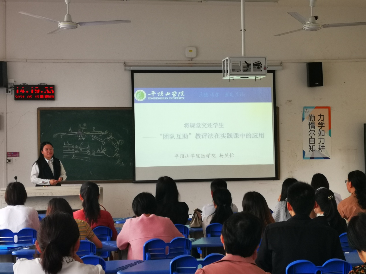 首先,护理系周晓欢老师以急危重症护理学课程建设为例,分享了申报省级“战疫”类课程思政样板课程的宝贵经验。周晓欢老师分别从建设基础、目标方法、建设效果、建设规划等方面,详细介绍了急危重症护理学课程思政建设情况和申报书填写的技巧。临床医学系杨笑怡老师以“将课堂交还学生---‘团队互助’教评学在实践课中的应用”为题,分享了“团队互助”教评法的理论基础、实训课中的实践经验及遇到的困难及解决办法。