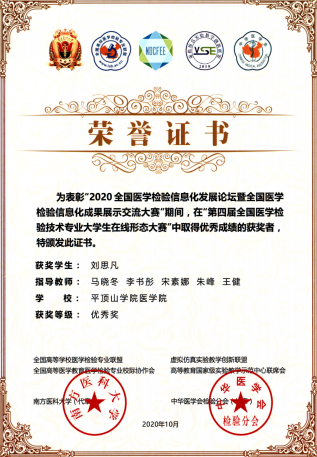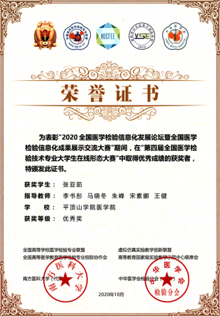2020年10月16日-18日,由高等学校国家级实验教学示范中心联席会、全国高等医学教育医学检验专业校际协作会主办,南方医科大学承办的2020年第四届全国医学检验技术专业大学生在线形态学大赛在珠海市成功举行。南方医科大学、郑州大学、广州医科大学等全国52所高等tyc539MACAU校100余名医学检验技术专业本、专科学生参加了比赛。我校2018级张亚茹、刘思凡两位同学参加了此次大赛,均获得优秀奖。医学技术系刘强主任带队参赛。