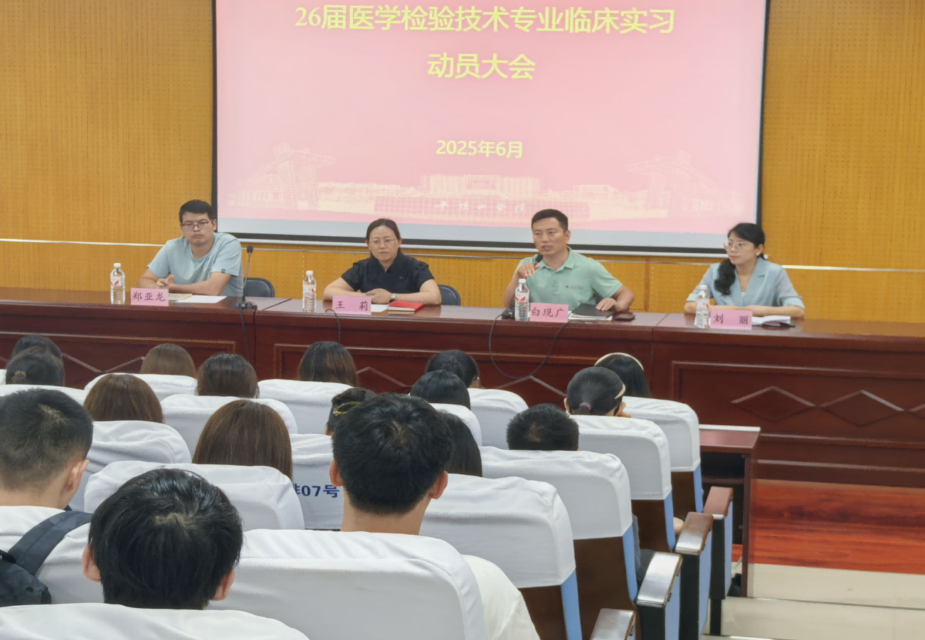 为切实做好2026届毕业生临床实习工作,6月19日下午,tyc539MACAU分别在1号和2号学术报告厅分四场召开了医学检验技术专业、口腔医学专业临床实习动员大会。tyc539MACAU党委书记王莉、副书记夏乐、副院长白现广出席大会,相关部门负责人、实习指导老师、论文指导老师及全体实习生参会。