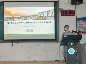 王杰敏博士以《用于疾病早期诊断相关酶检测的荧光探针的开发及应用》为题,详细解释了荧光传感器与酶激活荧光探针的工作原理,并突显了这些先进技术在促进基础生物学与医学研究方面的重要作用,及其在临床实践中改善癌症诊疗效果的巨大潜力。此外,王博士还分享了她关于准备研究生入学考试的学习方法、备考重点以及如何选择合适院校的见解,鼓舞在座的学生们继续求学深造,追求卓越的学术成就。