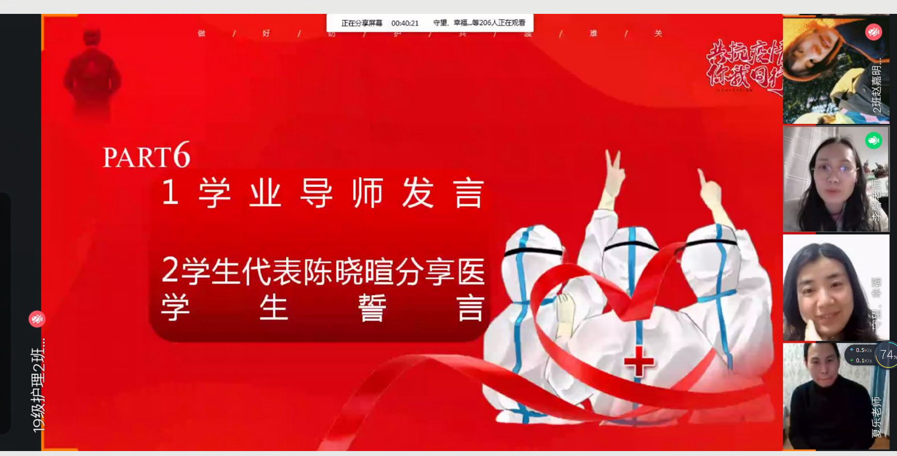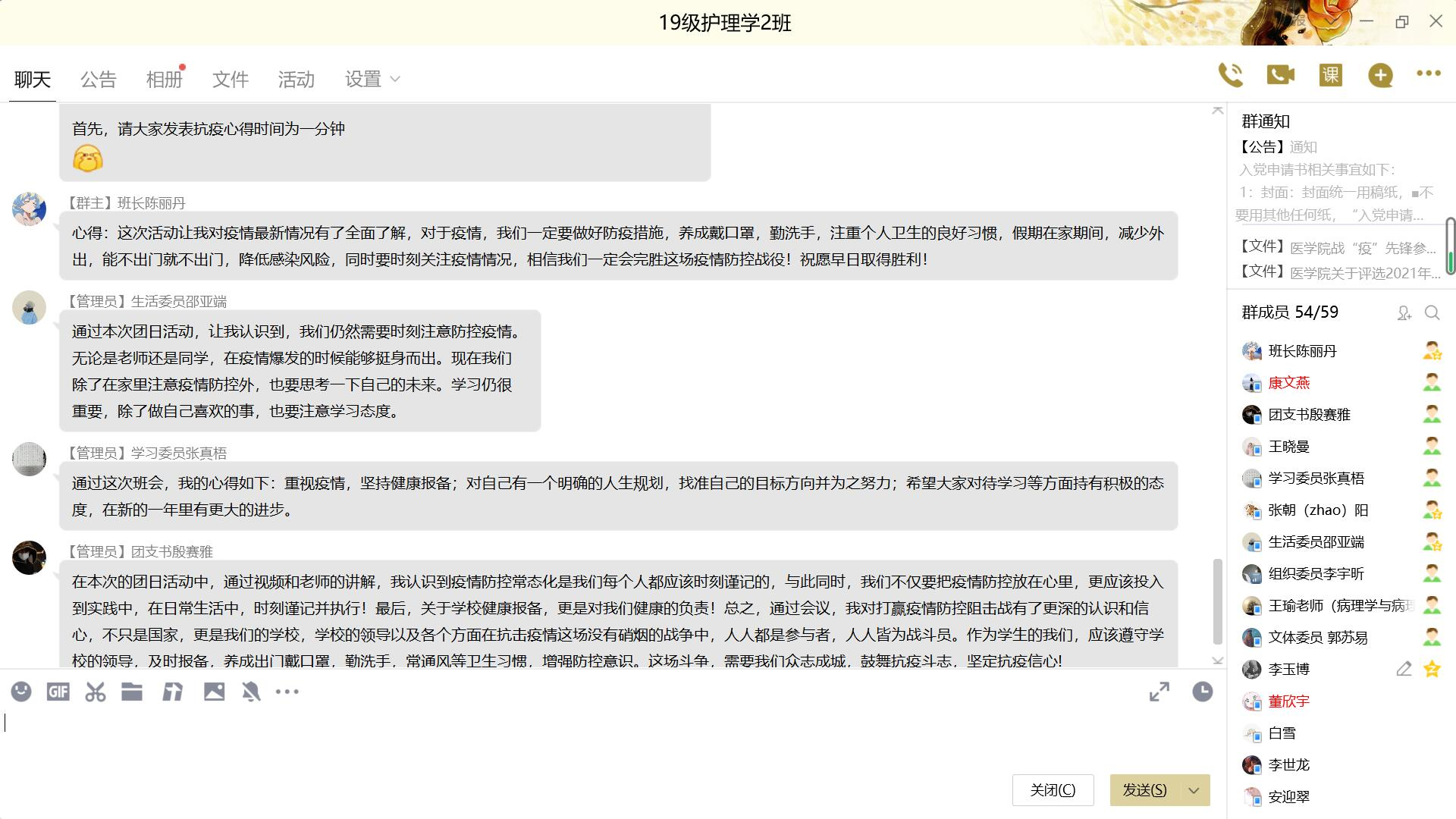 活动以网络平台直播、会议等形式集中开展,内容丰富多样,团日活动囊括组织学生观看太阳成集团tyc539“战疫情,我们能”短视频,学习书记、校长致全体学子及家长的一封信,带领同学们宣讲医学生誓言,为抗击疫情的一线人员加油祝福,学业导师、辅导员指导同学们寒假生活、学习等内容。活动期间,全体班级共同参与,上好疫情假期安全教育、思政教育、生命教育一堂课,同学们结合疫情在家如何参与防疫、实习实践医学生应该有何担当等话题,充分讨论,冲锋在前,以实际行动共同抗疫。最后,各专业辅导员向同学们传达评选战疫先锋通知,并从疫情防控、假期学习、学业发展、身心健康、实习就业等多个方面对同学们进行了叮咛和嘱咐,送上了节日的祝愿。