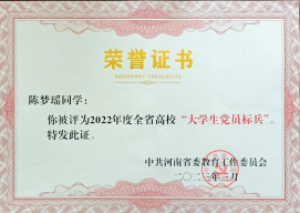 3月3日下午,全省高校“大学生党员标兵”评审结果公示,我院学子陈梦瑶荣获河南省“大学生党员标兵”荣誉称号。