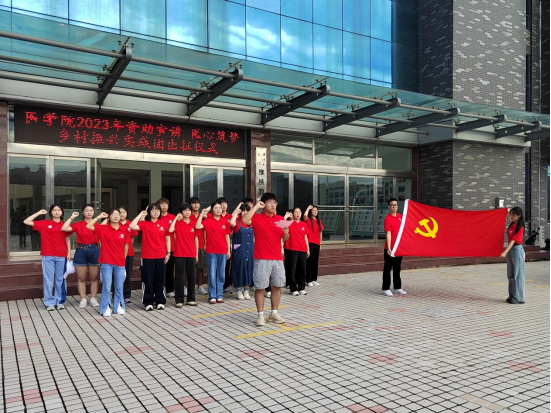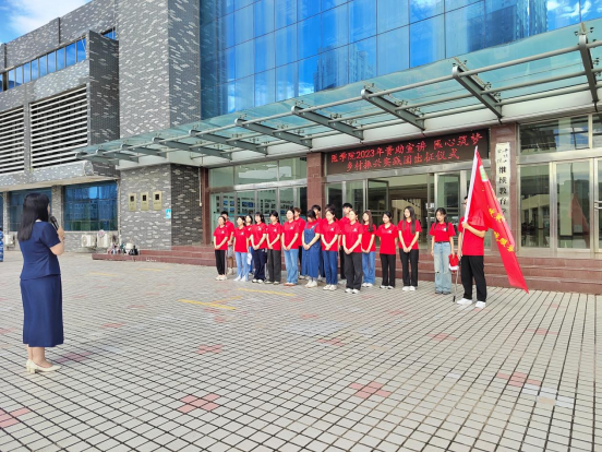 出征仪式共分为五项。首先由党委副书记冯建宣读“三下乡”文件及成员名单。接着由实践团长单俊尧带领学生队伍集体进行志愿宣誓。随后由副院长王福安对学生队伍进行授旗,红旗飘飘,队员们热情高涨,他们期待着接下来丰富的下乡生活。接下来,院长郑新华作总结讲话,对本次实践活动提出寄语与希望,希望带队老师和同学们牢牢树立“安全第一”的意识,始终把安全工作放在首位,并把社会当做大课堂,时刻结合活动开展前培训中所学技能及专业知识,做好大众健康宣讲,同时虚心向人民群众学习,脚踏实地,勤思多问,并祝愿同学们在社会实践活动中取得丰硕成果,凯旋而归。全体人员与队旗合影留念,此次出征仪式落下帷幕。