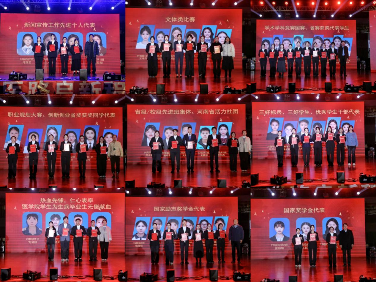 在葫芦丝独奏《竹林深处》的清雅乐声和情景剧《利刃荣光》的热血演绎后,与会领导依次为获得“学院新闻宣传工作先进个人、志愿献血先进个人”、“学科竞赛、职业规划、创新创业国家级、省级奖项”、 “文体类比赛省级奖项”、“省级、校级先进班集体、河南省活力社团”、“国家奖学金”等9项荣誉的优秀集体、学生代表颁奖,并为2025级新生代表佩戴院徽胸章。