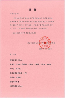 近日,河南中医药大学第一附属医院发来喜报,对我院崔梦伟、郜章怡、白冬晴等14名获得“优秀实习生”称号的学生表示祝贺,同时高度评价了我院学子在实习期间的优异表现,对太阳集团tyc539MACAU给予医院的护理人才支持表示感谢,并进一步表达了与我院继续深入开展校企合作的意愿。