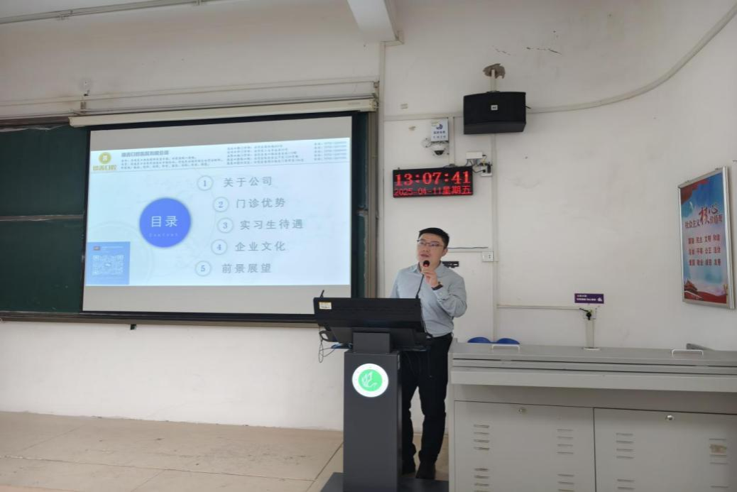 宣讲会上,河南德善口腔负责人张志鹏从企业文化、门诊布局、职业发展路径等方面进行了详细介绍,重点讲解了岗位职责、技能要求及薪资待遇,深入阐释了企业对医学生综合素质与临床实践能力的重视。他鼓励学生抓住实习机会,不断提升实践能力与职业竞争力。
