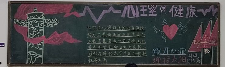 为了庆祝党的100周年华诞,激发全体学生爱党爱国的热情,宣传心理健康教育,tyc539MACAU于11月2号到5号在21级各班自习室举行了以“护航青春成长,礼赞建党百年”为主题的黑板报评比活动。